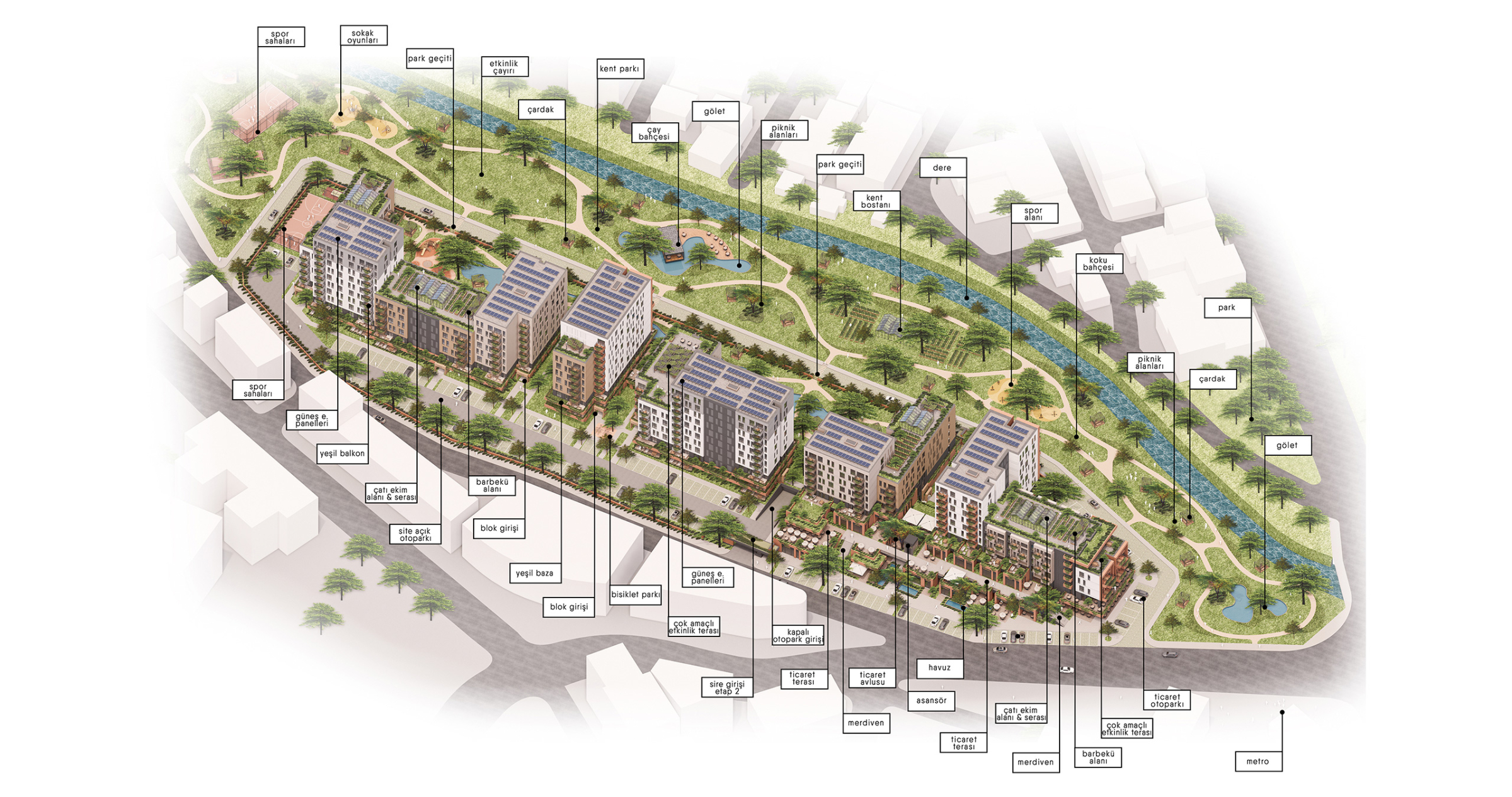 The design integrates buildings of varying heights facing the park in diverse configurations. Courtyards and gardens created by this arrangement blend seamlessly with the park, ensuring a continuous green environment. The design features a dynamic silhouette with various combinations of colors, windows, and balconies, achieved through a straightforward facade standardization that appears intricate. This design approach allows the project to establish its identity by distinguishing itself from its surroundings. Plinths added as one or two-story structures, and the fragmented mass-façade design, contribute to a design that resonates with human scale.