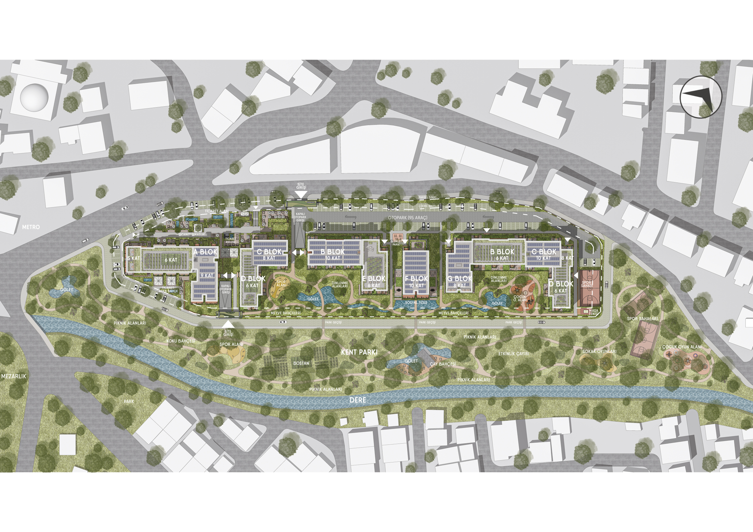 The design integrates buildings of varying heights facing the park in diverse configurations. Courtyards and gardens created by this arrangement blend seamlessly with the park, ensuring a continuous green environment. The design features a dynamic silhouette with various combinations of colors, windows, and balconies, achieved through a straightforward facade standardization that appears intricate. This design approach allows the project to establish its identity by distinguishing itself from its surroundings. Plinths added as one or two-story structures, and the fragmented mass-façade design, contribute to a design that resonates with human scale.
